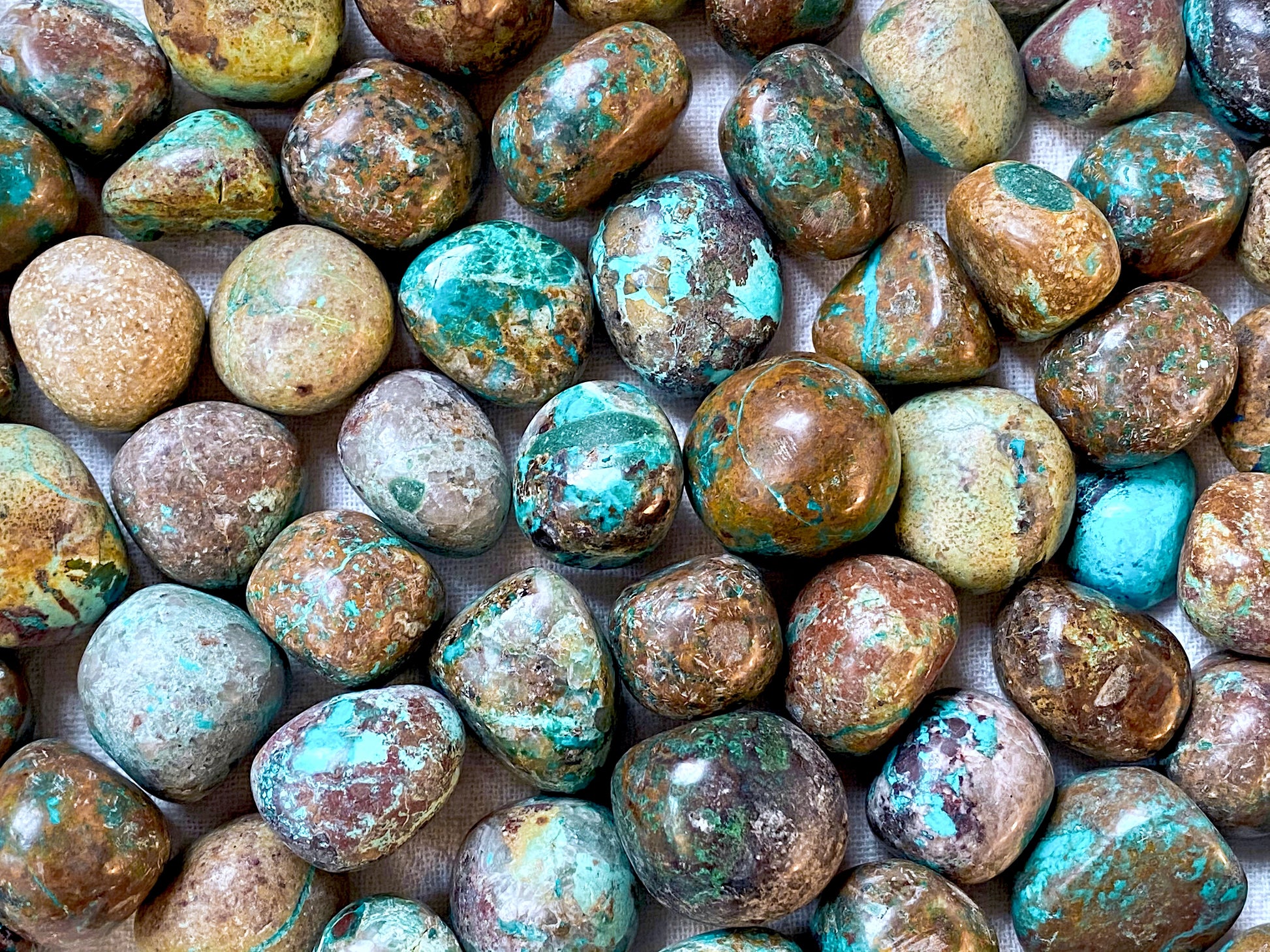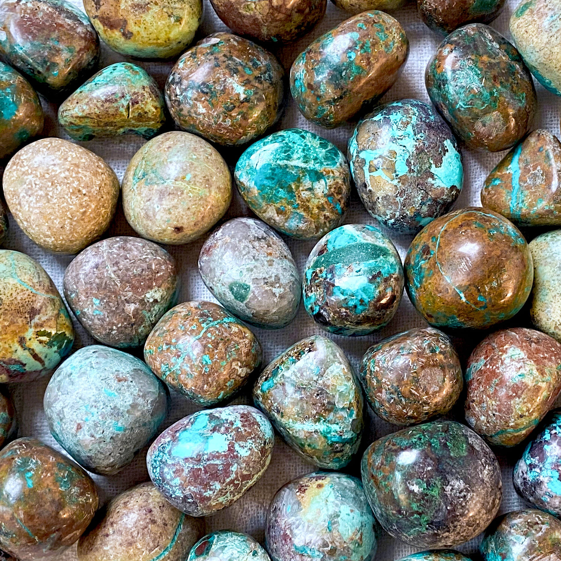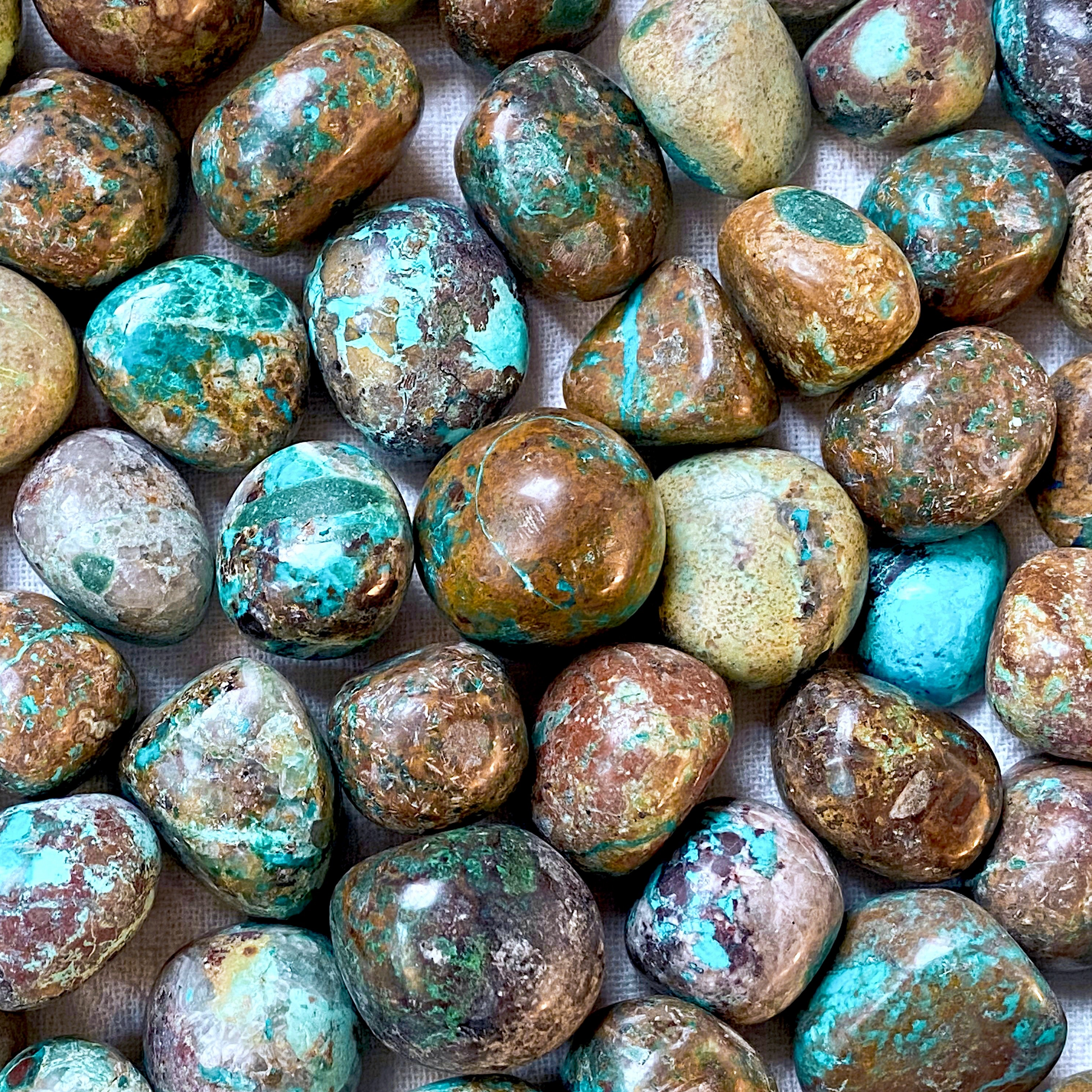 Chrysocolla, a serene gemstone exuding tranquility and empowered expression, flows with the gentle energy of soothing waters and vibrant landscapes. Its mesmerizing hues, ranging from serene blues to verdant greens, evoke a sense of calmness and inner peace. Mined from various locations worldwide, including the United States, Peru, and Russia, chrysocolla is revered for its ability to promote emotional healing, communication, and empowerment.