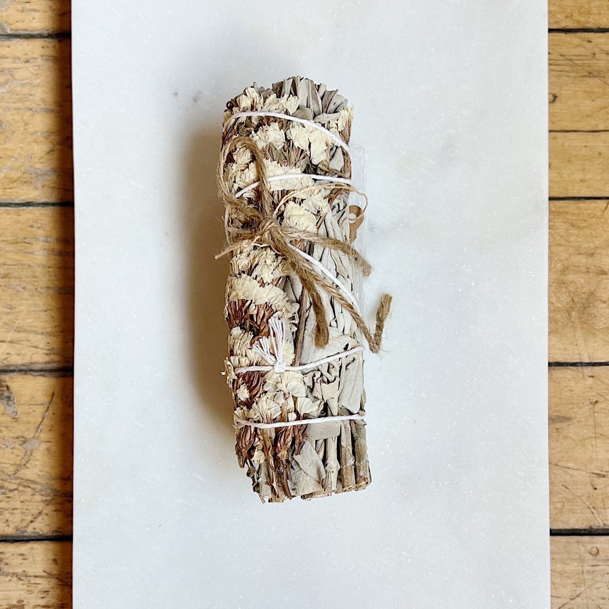 White Flower / Sage, known for its strong and distinct aroma, has been used for centuries by Native American cultures and many others for its cleansing and purifying properties. Selenite, a crystal with a high vibration, is believed to clear negative energy and promote mental clarity. And Palo Santo, a sacred wood from South America, is known for its calming and grounding effects.