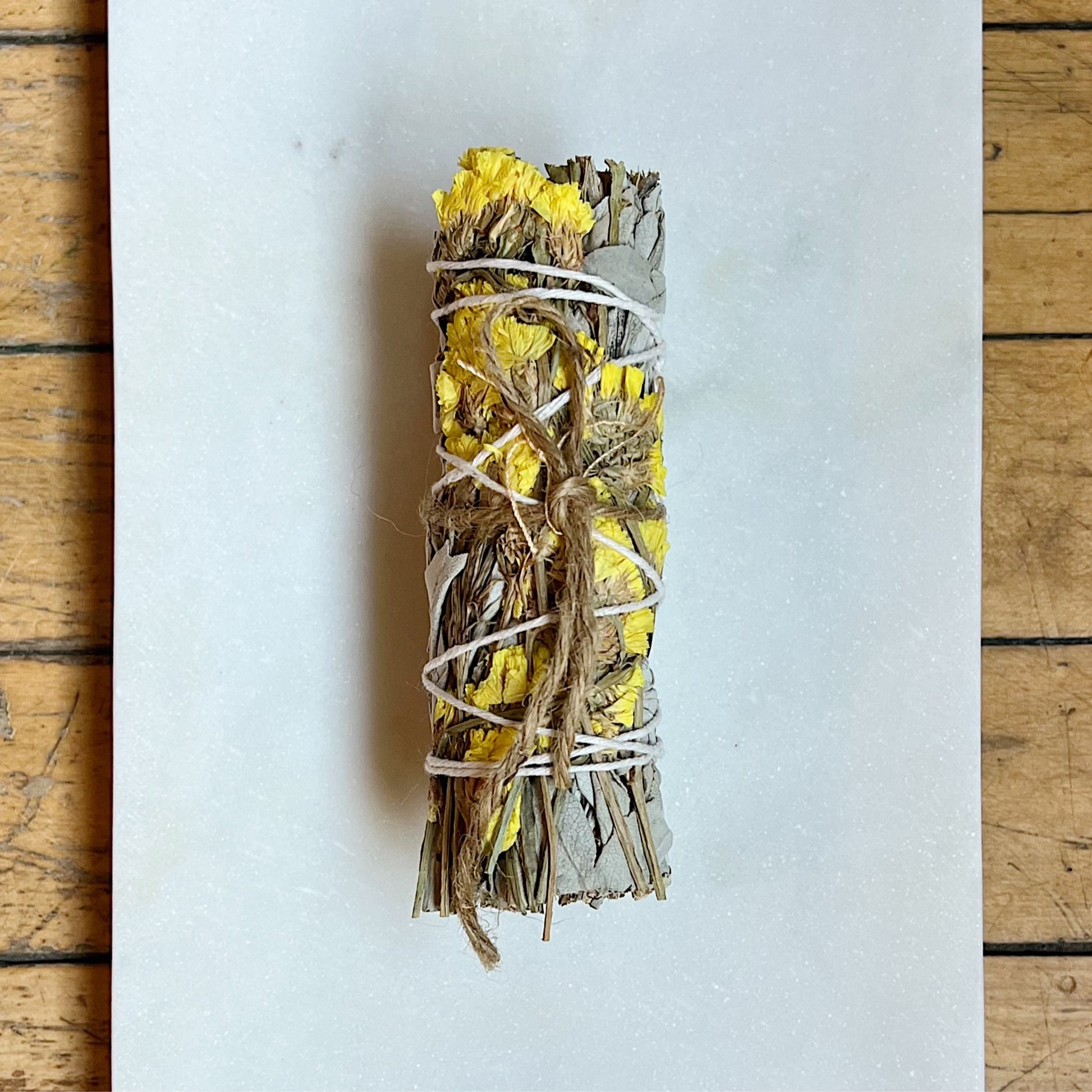 Yellow Flower / Sage is known for its ability to purify and cleanse negative energy while promoting positivity and clarity. Selenite is a powerful crystal that can help to clear and balance the energy in a space, promoting a sense of peace and tranquility. Palo Santo, also known as 'holy wood,' has been used for centuries in spiritual rituals for its cleansing and healing properties.