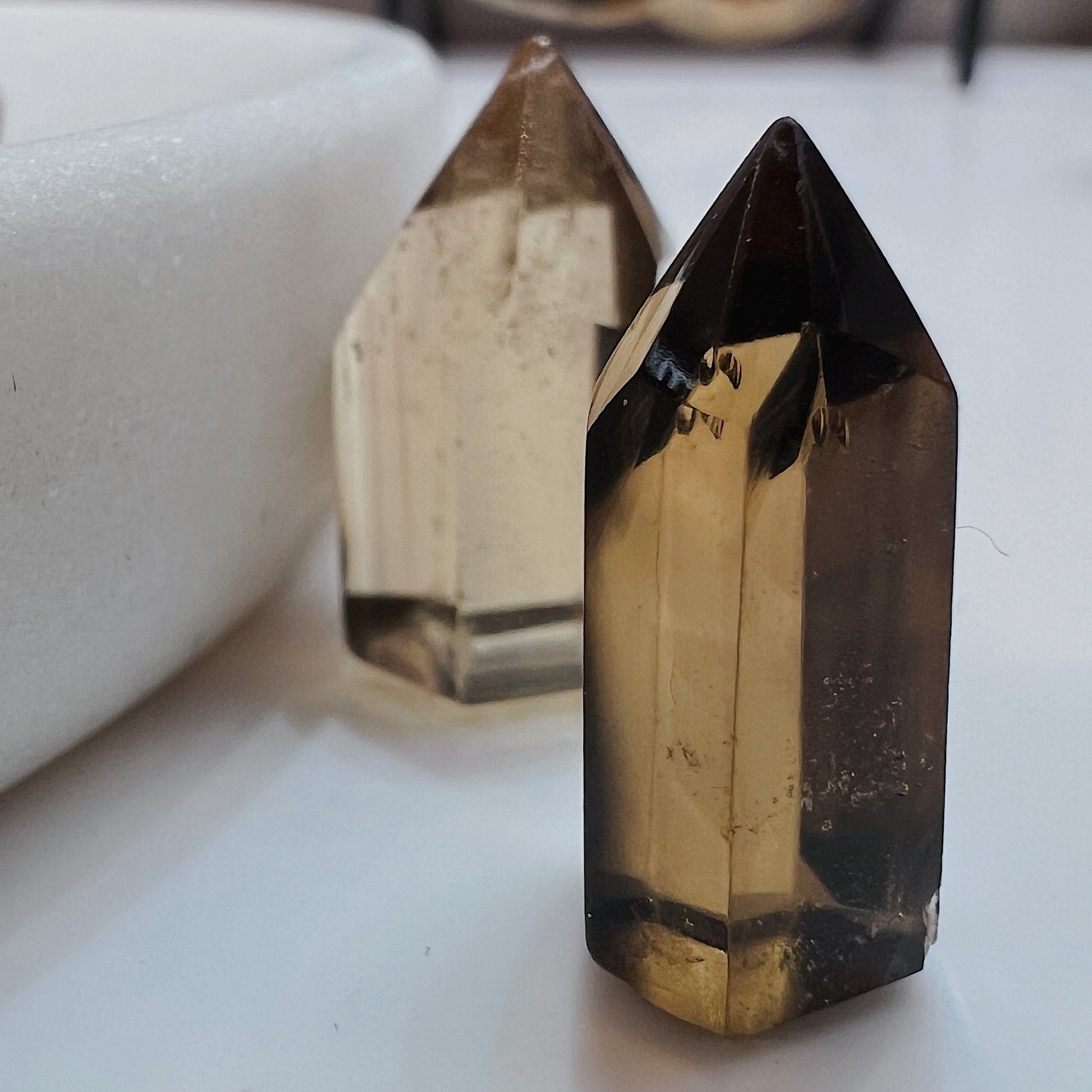 Experience the exceptional quality of Smoky Quartz Mini Towers, sourced from Brazil's finest deposits. These beautifully crafted towers highlight the stone’s deep, smoky tones and natural clarity, offering both aesthetic appeal and energetic grounding benefits. Ideal for collectors, practitioners, or decor enthusiasts, each mini tower exemplifies expert craftsmanship and premium material, perfect for enhancing any space with authentic Brazilian Smoky Quartz.